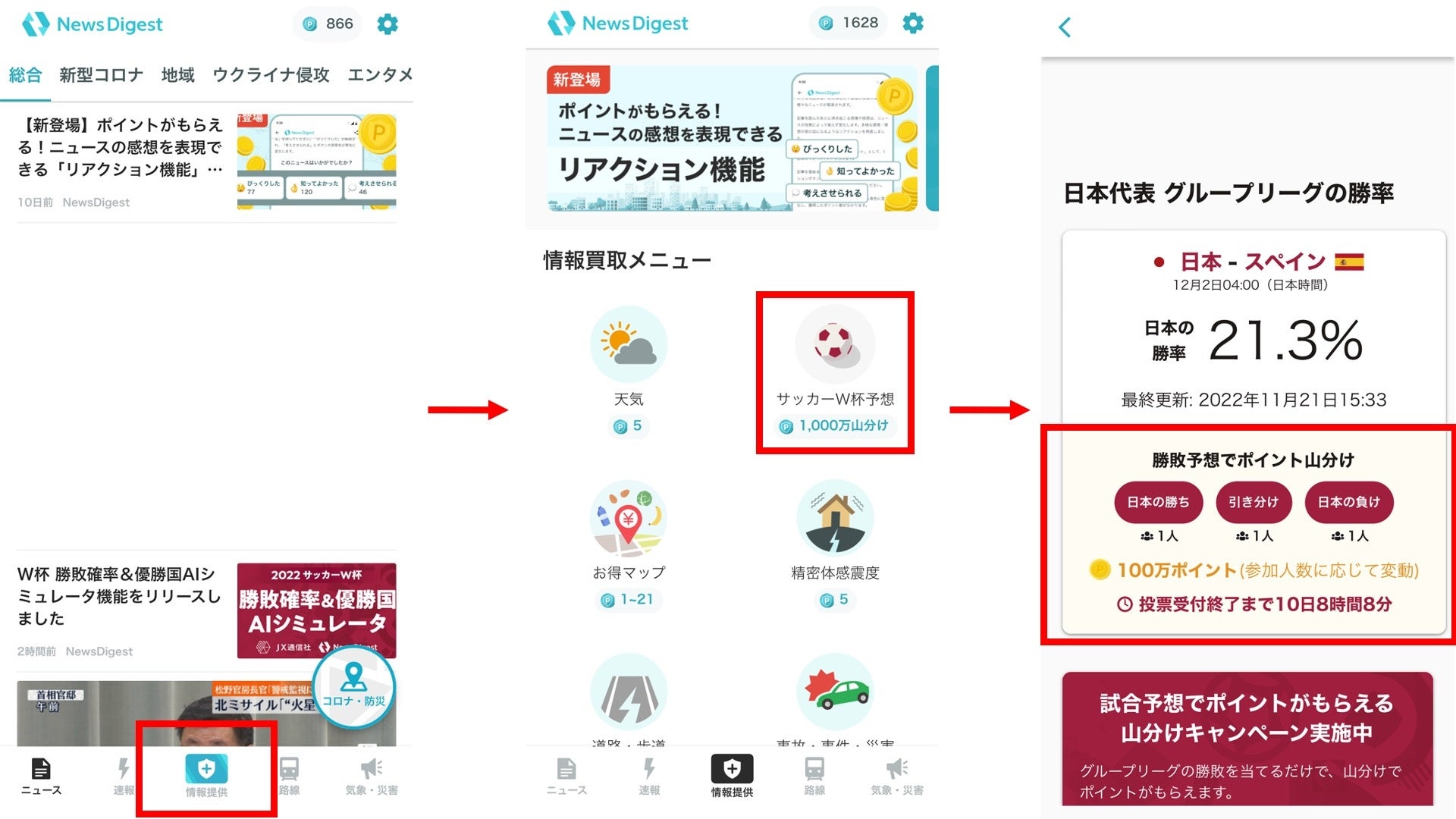 キャンペーンには、当社が提供する「2022サッカーW杯 勝敗確率&優勝国 AIシミュレータ」に、「NewsDigest」からアクセスすることで参加可能です。下部の「情報提供」ボタンを押し、「サッカーW杯予想」からページに遷移すると、日本代表の「勝ち」「負け」「引き分け」を予想するボタンが押下できるようになります。
