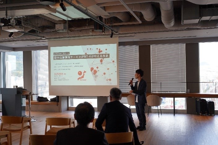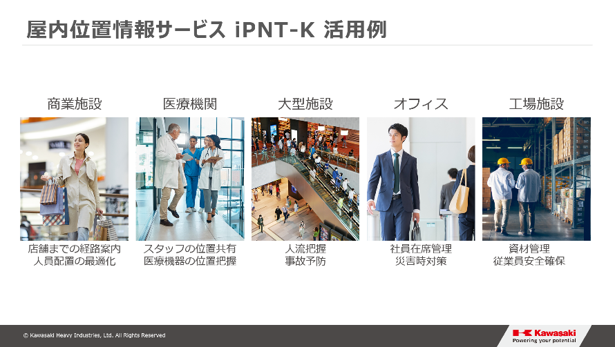 イベントでは冒頭、川崎重工業イノベーション部の原さんより、事業内容や同社のオープンイノベーション、新規事業についての取り組みについて紹介がありました。新規事業の一環として事業展開しているのが、この屋内位置情報サービスiPNT-Kです。