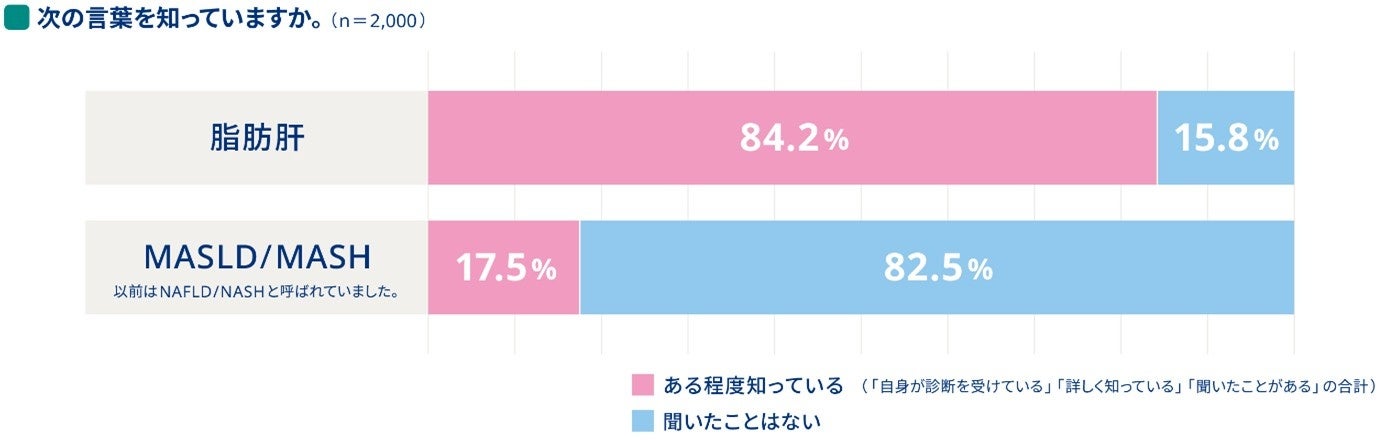 MASLD/MASHの認知度 (約17.5%) は、脂肪肝の認知度 (約84.2%) の約5分の1と低いことが明らかになりました。 (図1)