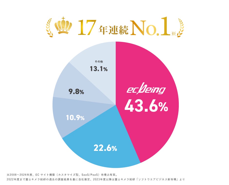株式会社ecbeing(イーシービーイング 本社:東京都渋谷区、代表取締役社長:林 雅也、以下ecbeing)は、株式会社富士キメラ総研の発行する「ソフトウェアビジネス新市場 2025 年版」の EC サイト構築(カスタマイズ型/SaaS)市場において、国内シェア No.1※1を獲得しました。これにより、17 年連続で市場シェア No.1※1となりました。