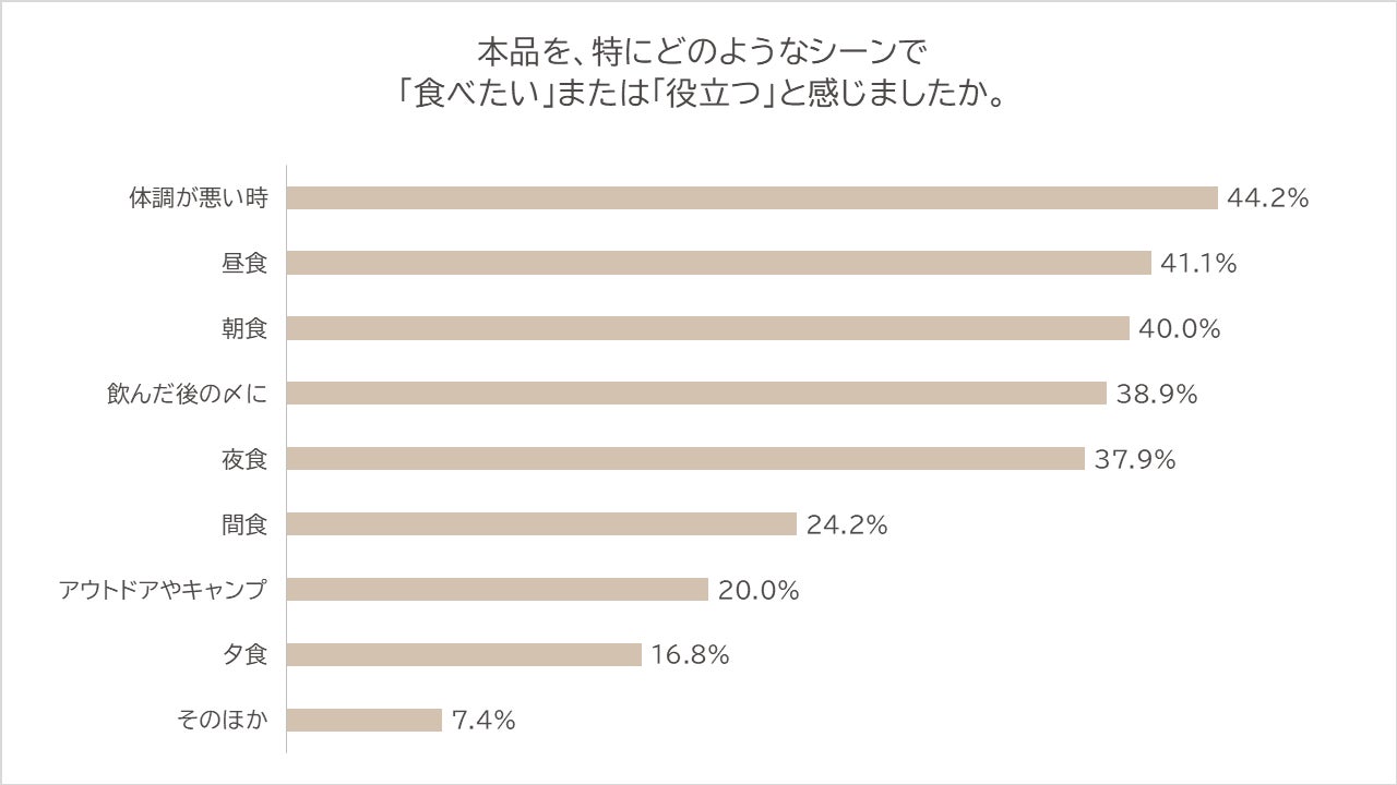 「食べたい/役立つ」と感じたシーンは、「体調が悪い時(44.2%)」がトップ。次いで「昼食(41.1%)」「朝食(40.0%)」「飲んだ後の〆(38.9%)」が続き、さっと食べたい局面でのニーズが目立ちました。