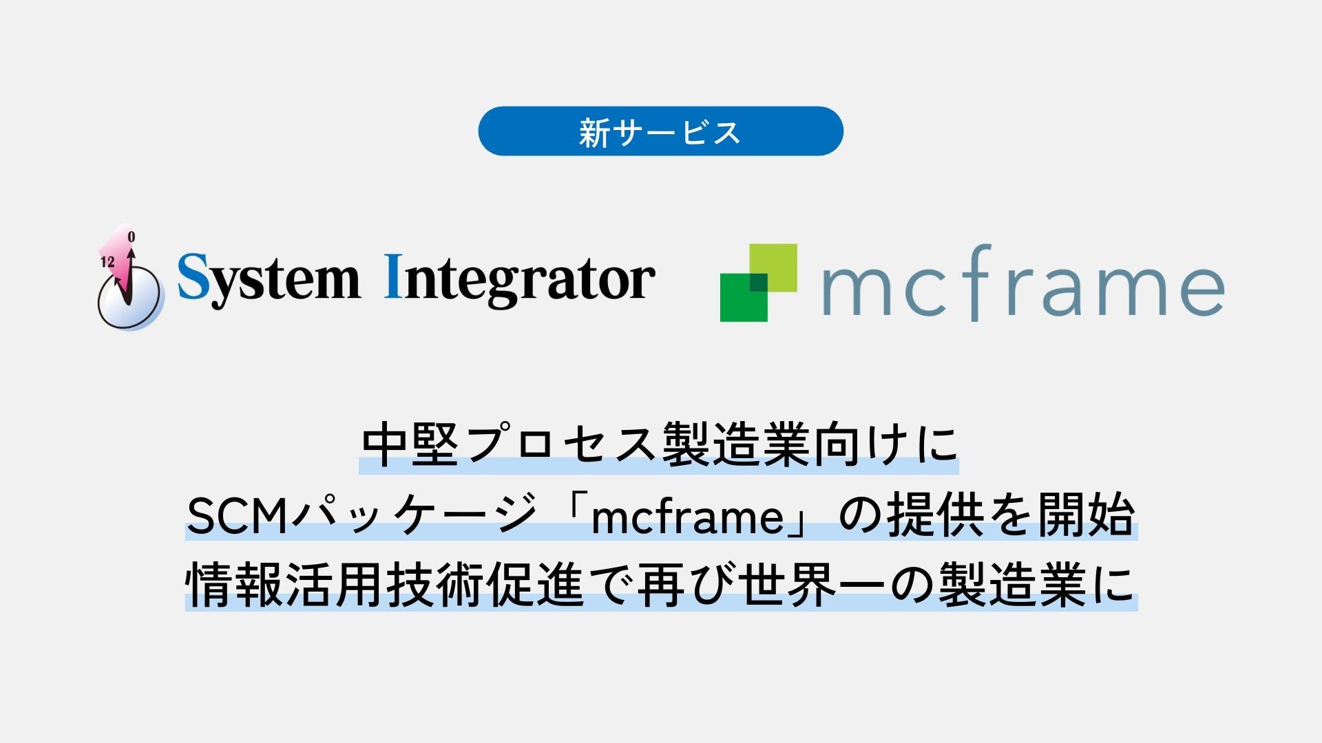 株式会社システムインテグレータ(本社:さいたま市中央区、代表取締役社長:引屋敷 智、東京証券取引所スタンダード市場 証券コード3826、以下「当社」)は、ビジネスエンジニアリング株式会社(本社:東京都千代田区、代表取締役社長:羽田 雅一、東京証券取引所プライム市場 証券コード4828、以下「B-EN-G」)と、2025年1月14日付で同社のSCMパッケージ「mcframe」に関するビジネスパートナー契約を締結し、「mcframe」の販売を開始したことをお知らせします。