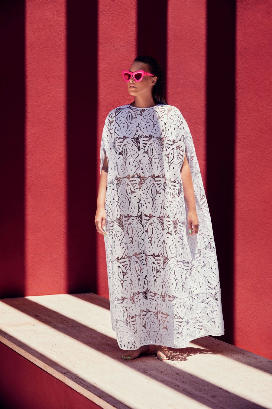 コレクションを代表するカルトアイテムは、サラ・バッタリヤが特別にデザインしたマクラメレースのゆったりとした長いケープです。冬のコレクションで発表された同デザインをブラック、ホワイト、エメラルドグリーンの3色で新たに表現しています。こちらの素材でパフスリーブのイエローシャツドレス、オーバーサイズシャツ、サークルスカートにも生命を吹き込んでいます。