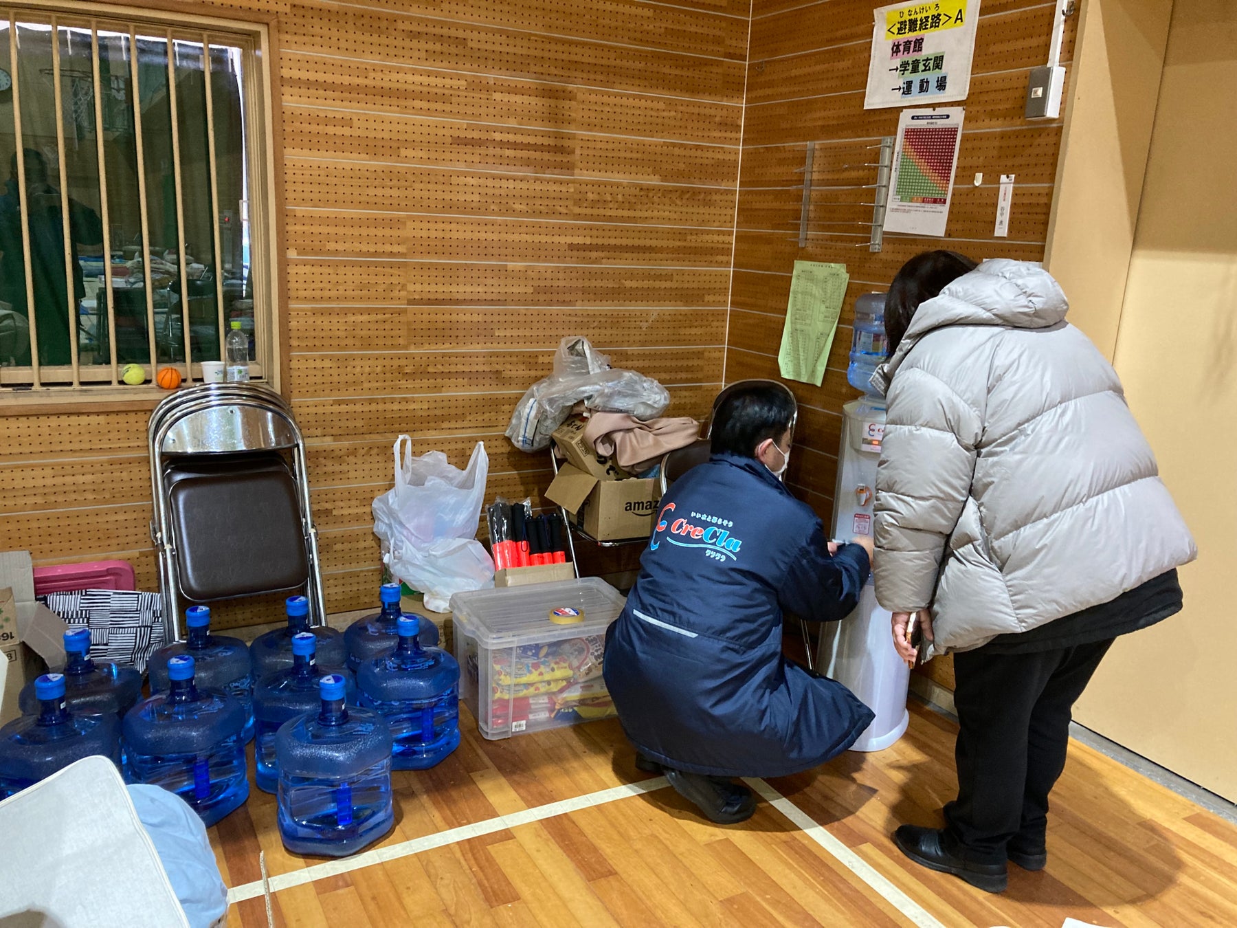クリクラは震災後すぐに現地支援を実施するため、当社クリクラ社員6名を現地に派遣。地域の加盟店と協力し3チーム体制で、特に被害が甚大なエリア(石川県七尾市、能登町、穴水町、富山県氷見市)の避難所へ支援物資をお届けいたしました。また、被災地域のお客様宅へ直接訪問し、転倒したサーバーの入替などを実施いたしました。地震の直後は液状化現象・道路の陥没・土砂崩れによる通行止めなどがあり、現地で対応したスタッフからは「通常30分程度でお届けできる地域も、今回は数時間かかってしまった」との報告がありました。