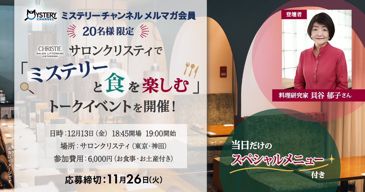 さらに、12月13日(金)にはミステリーチャンネルメルマガ会員限定のトークイベントを開催します。料理研究家でミステリーを食のシーンから楽しむ著書も多い貝谷郁子さんに、「ミステリーと食」をテーマにお話しいただきます。イベント当日は、この日だけのスペシャルメニューをご用意。お申込みは、本日11月18日(月)よりミステリーチャンネルウェブサイトにて受付スタートします。