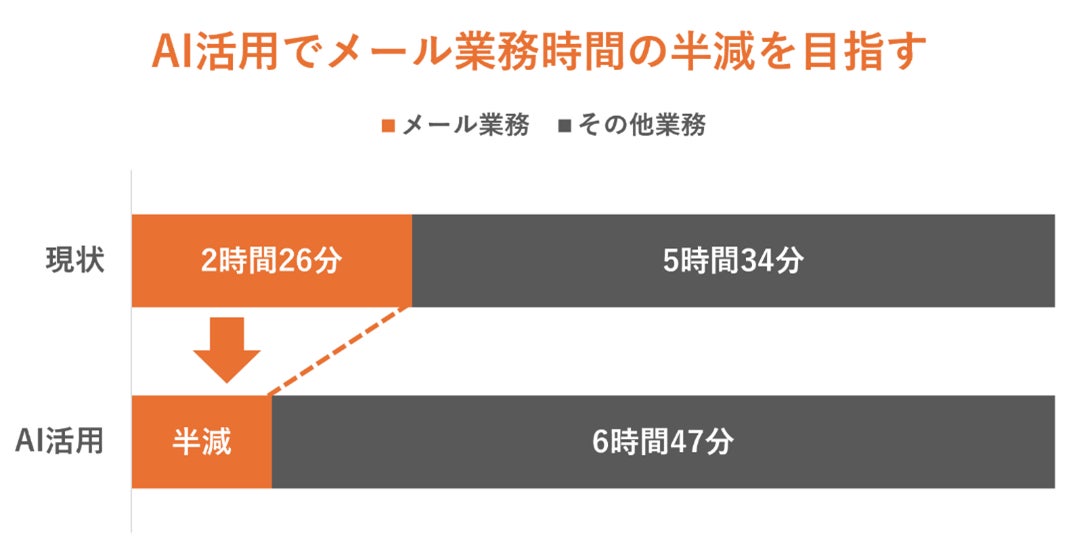 一般社団法人日本ビジネスメール協会が2025年6月2日に発表した「ビジネスメール実態調査2025」によると、1日の業務時間のうち、メール送受信にかかる時間は約3割にあたる約2時間26分にも及ぶとされています。メール内容の確認や文章表現の検討・推敲に多くの時間が費やされていることが、多忙なビジネスパーソンにとって大きな負担となっています。
