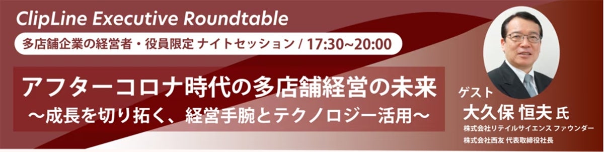 本イベントは、「多店舗経営の未来」をテーマに、多店舗/多拠点展開する企業の経営層・役員・責任者の方限定で、議論・考察していくプログラムです。スペシャルゲストには、株式会社リテイルサイエンス ファウンダー、株式会社西友 代表取締役社長の大久保 恒夫氏をお招きし、多店舗・多拠点・チェーン展開する企業における価値創造やテクノロジー活用のあり方について伺い、皆様のご意見/ご質問を交えながらディスカッションを展開していきます。ClipLineからは意思決定力を支えるテクノロジー活用事例をご紹介し、経営者に必要な考え方や経営の高度化へのヒントを模索してまいります。