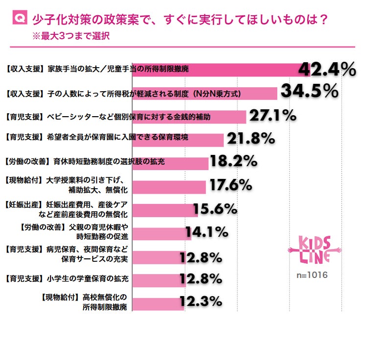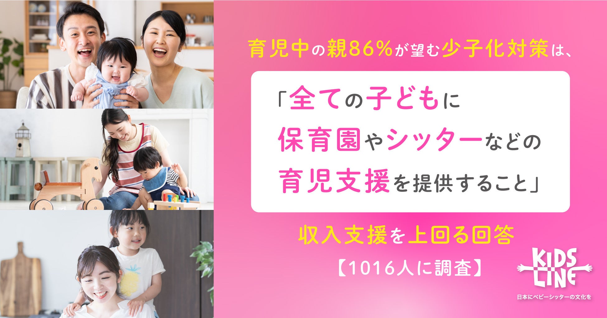 全国47都道府県で24時間ベビーシッター・家事代行サービスをスマホで依頼できる「キッズライン」を運営する株式会社キッズラインは、政府による『異次元の少子化対策』の3月末の取りまとめを前に、子育て中の親1016人に「少子化対策になると思う政策」などについて調査を実施。その結果をお知らせいたします。