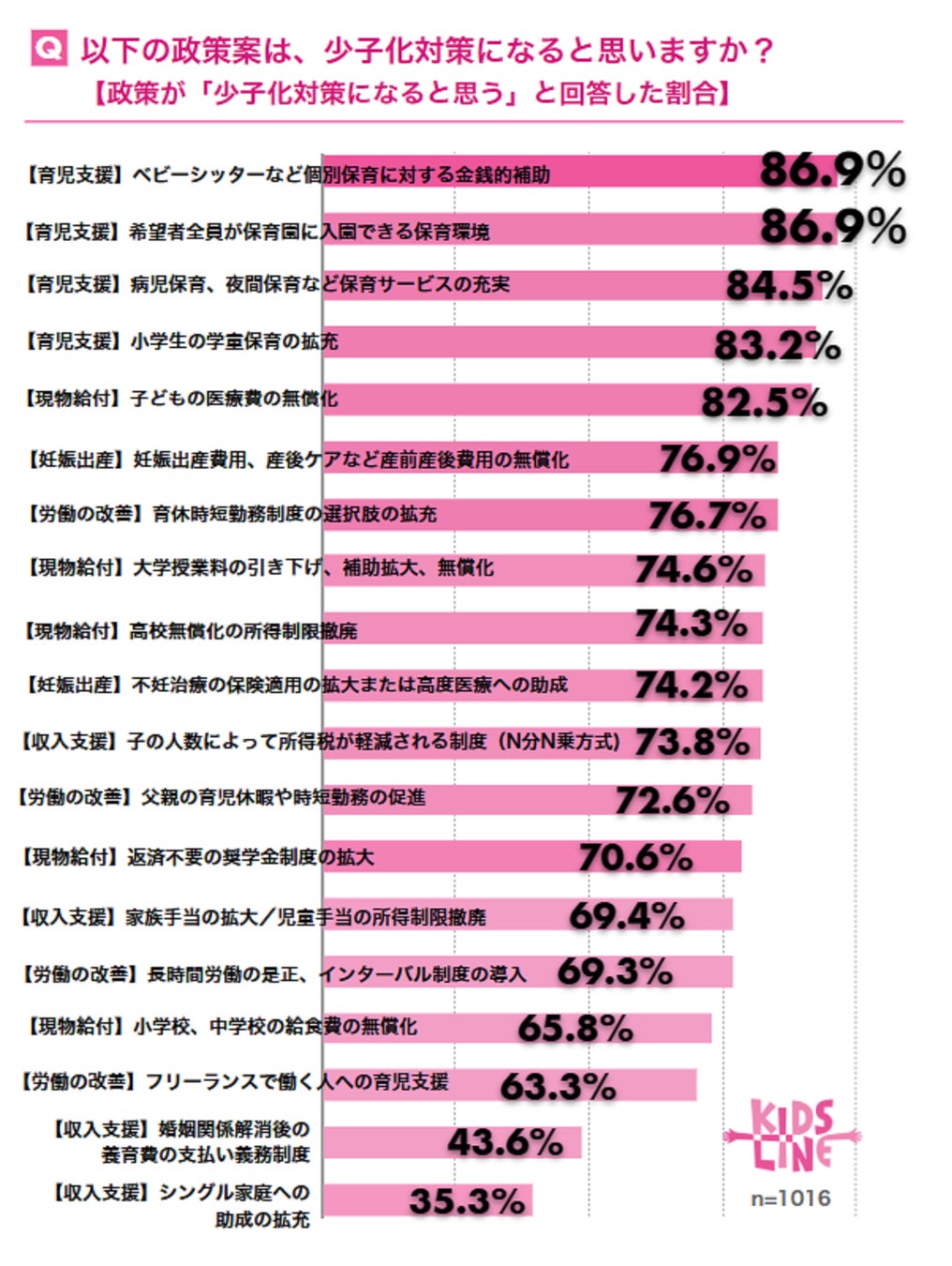 子育て中の親が最も多く「少子化対策になる」と回答したのは、「希望者全員が保育園に入園できる保育環境」(86.9%)と、「ベビーシッターなど個別保育に対する金銭的補助」(86.9%)でした。