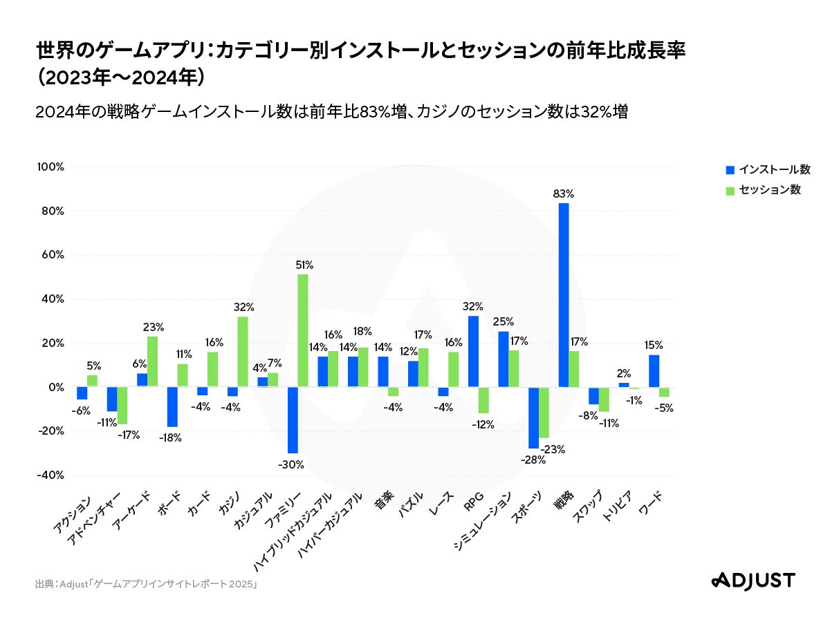 モバイルアプリの計測・分析ツールを提供するAdjust(本社:独・ベルリン、CEO:アンドレイ・カザコフ、日本ゼネラルマネージャー:佐々直紀)は、最新の「ゲームアプリインサイト 2025」レポートを発表しました。2024年のゲーム業界では、アプリのインストール数が前年比4%増加した一方、セッション数はわずかに減少(-0.6%)しました。本レポートでは、2023年に低迷したゲーム業界がどのように回復し、2024年の成長を維持しながら、ユーザーの継続率と定着率の向上が期待される2025年の展望について解説しています。