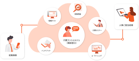 “仕事と介護の両立”を支援する企業様向け福利厚生サービス『わかるかいごBiz』は、従業員様の介護に関する「実態把握」から、「介護セミナー」「介護情報サイト」「介護ハンドブック」「介護e-ラーニング」など支援施策のご提供、また「介護コンシェルジュ(相談窓口)」設置により具体的な課題解決のサポートまで、一気通貫のご支援を特徴としており、これまでに200社/200万人を超える従業員様・ご家族様へご提供しております。
