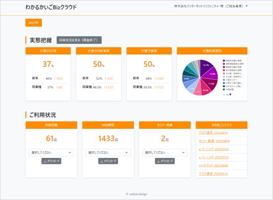 このたび、これらの各種コンテンツをより有効的に、効果的にご活用いただくことを目的とし、人事ご担当者様がクラウド上で一元管理・分析まで行える『わかるかいごBizクラウド』を新たに開発、ご提供を開始いたしました。