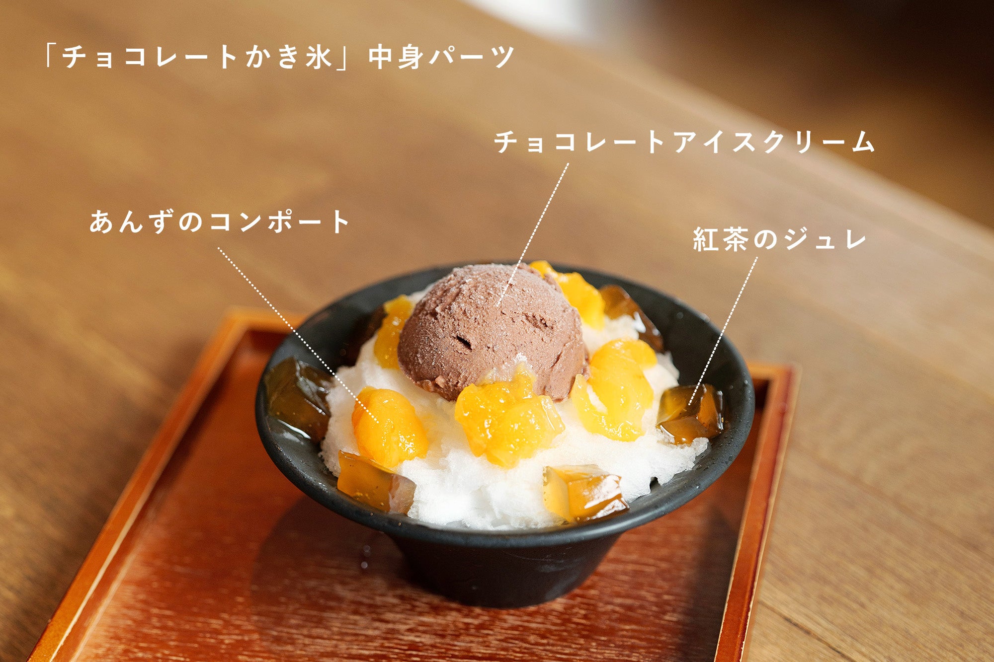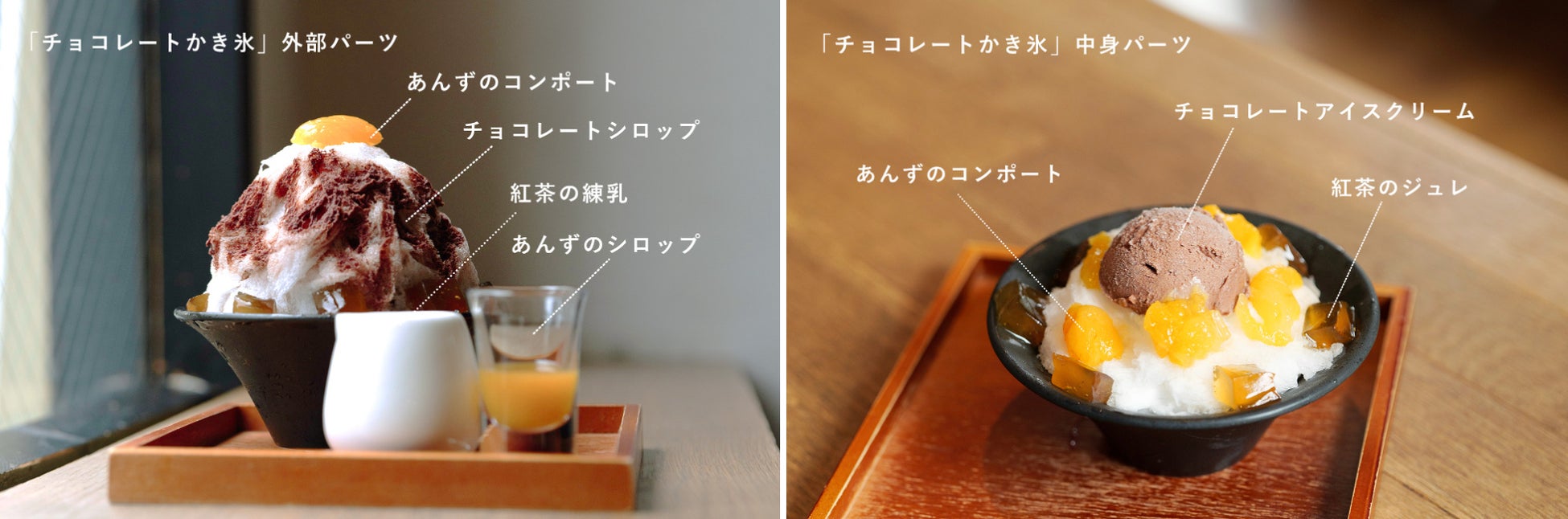 一口目はチョコレートシロップとかき氷を、次に紅茶の練乳で華やかな香りと甘味、もちもちとしたジュレの食感のアクセントをお楽しみください。さらにあんずシロップをかけることで甘酸っぱさと見た目の華やかさをお楽しみいただけます。食べ進めると現れる、かき氷の中に隠れているチョコレートアイスクリームが満足感を加えてくれます。最後に杏のコンポートによってねっとりとした食感の変化があり、凝縮感のある甘みと爽やかな酸味の余韻を楽しめます。