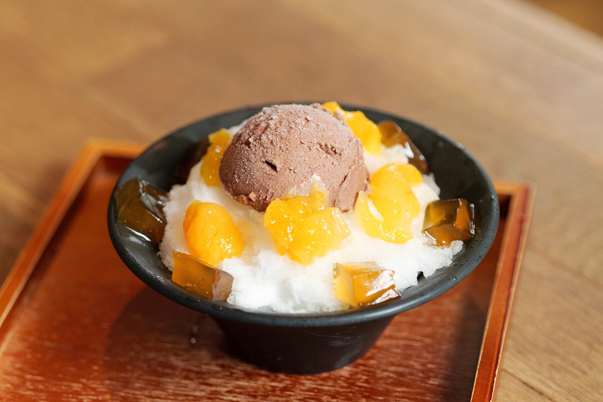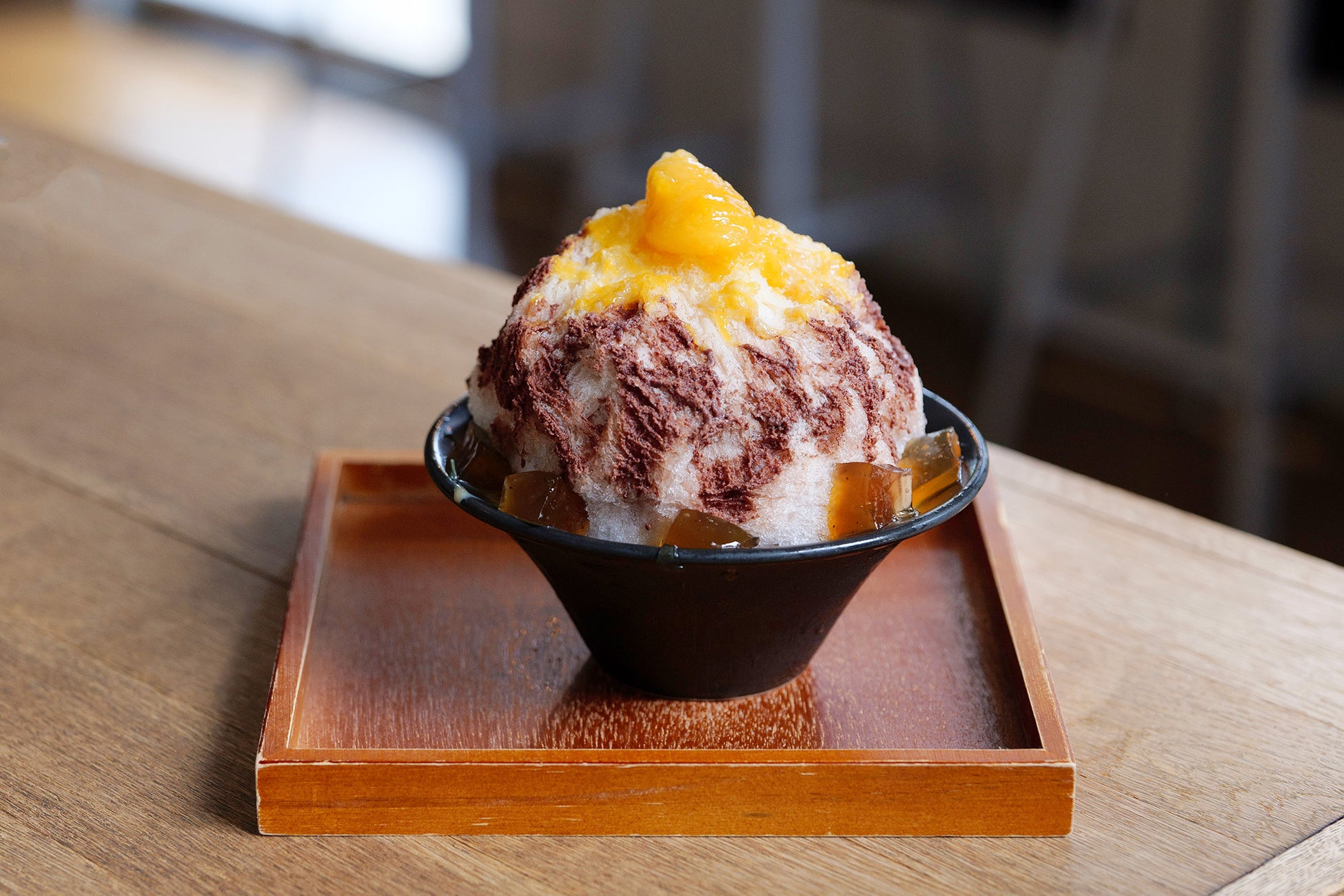 口に入れた瞬間、ふわっとした氷の食感と一緒に満足感のあるチョコレート、紅茶の香りと練乳の甘味、そして甘酸っぱいあんずの味わいが広がる、チョコレート専門店ならではのかき氷です。かき氷の中にはフルーティなチョコレートを使ったアイスクリームが1玉丸々隠れています。今年はあんずソースを用いることで、軽やかながら全体に満足感と華やかさをプラスしました。食べ進めるごとに変化する6パーツのハーモニーをお楽しみください。