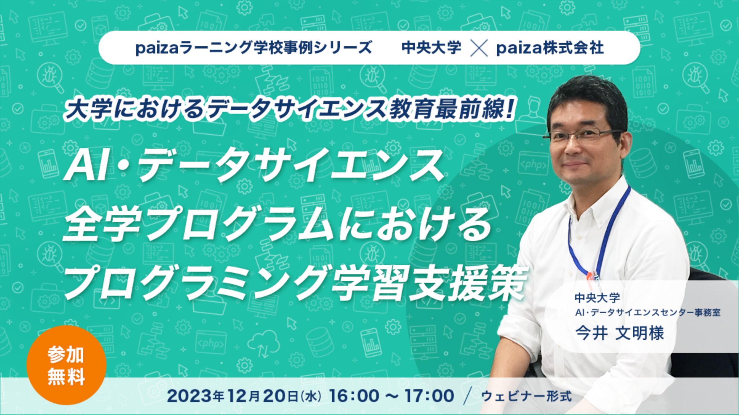【大学・専門学校の教員向け無料ウェビナー】paizaラーニング学校事例シリーズVol.3「大学におけるデータサイエンス教育最前線!~中央大学様事例~」12月20日(水)開催