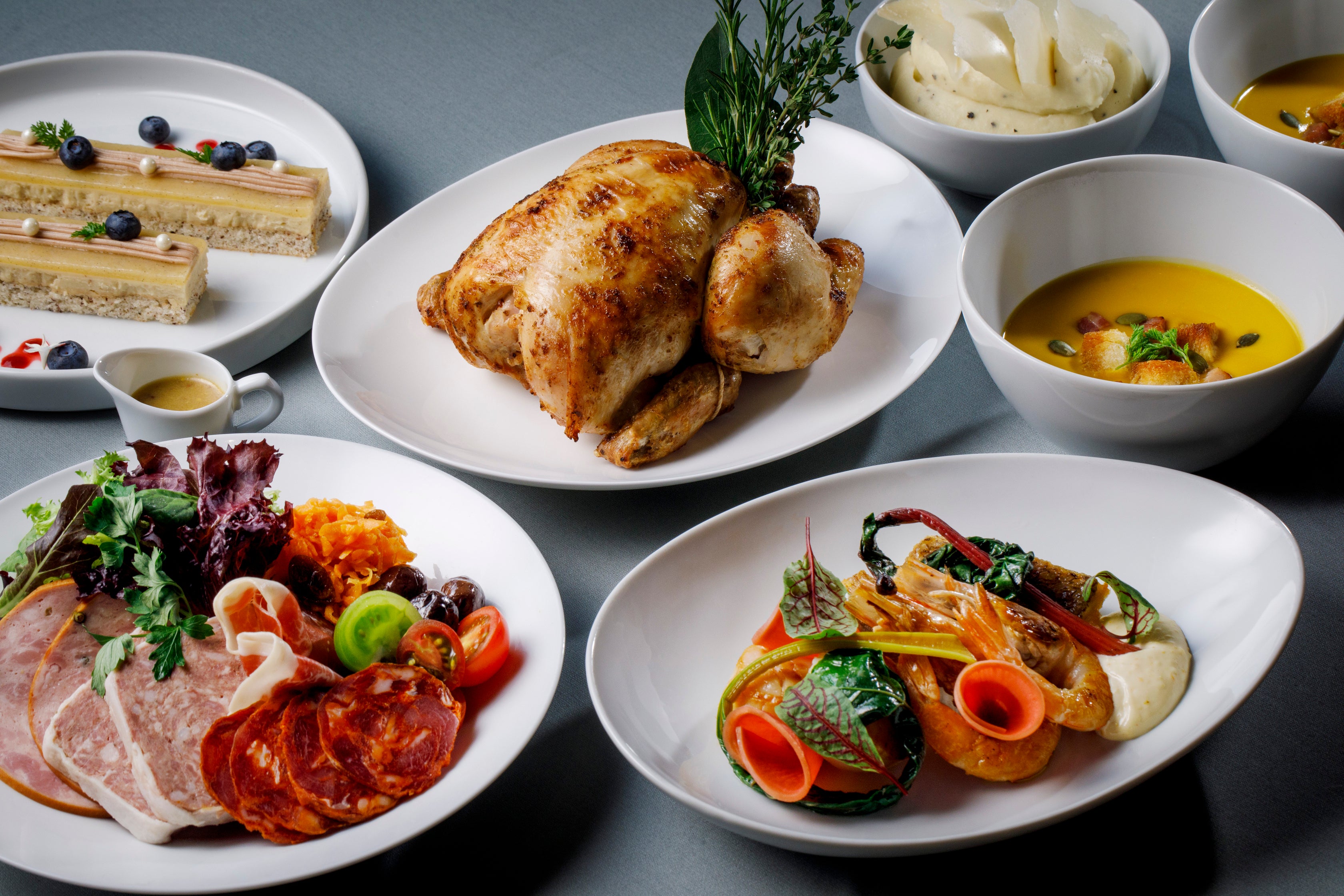 本格的なフルコースをご自宅で手軽にお召し上がりいただけます。ワインとも好相性のシャルキュトリーを添えたサラダに始まり、南瓜の甘みを生かしたスープ、アイオリソースを添えた帆立や海老などのシーフードに続き、メインはハーブが香るローストチキンに黒トリュフを混ぜ込んだマッシュドポテトを添えて。「デリカテッセン」料理長、桑澤剛がご用意するディナーとともに、心に残る聖夜をお過ごしください。