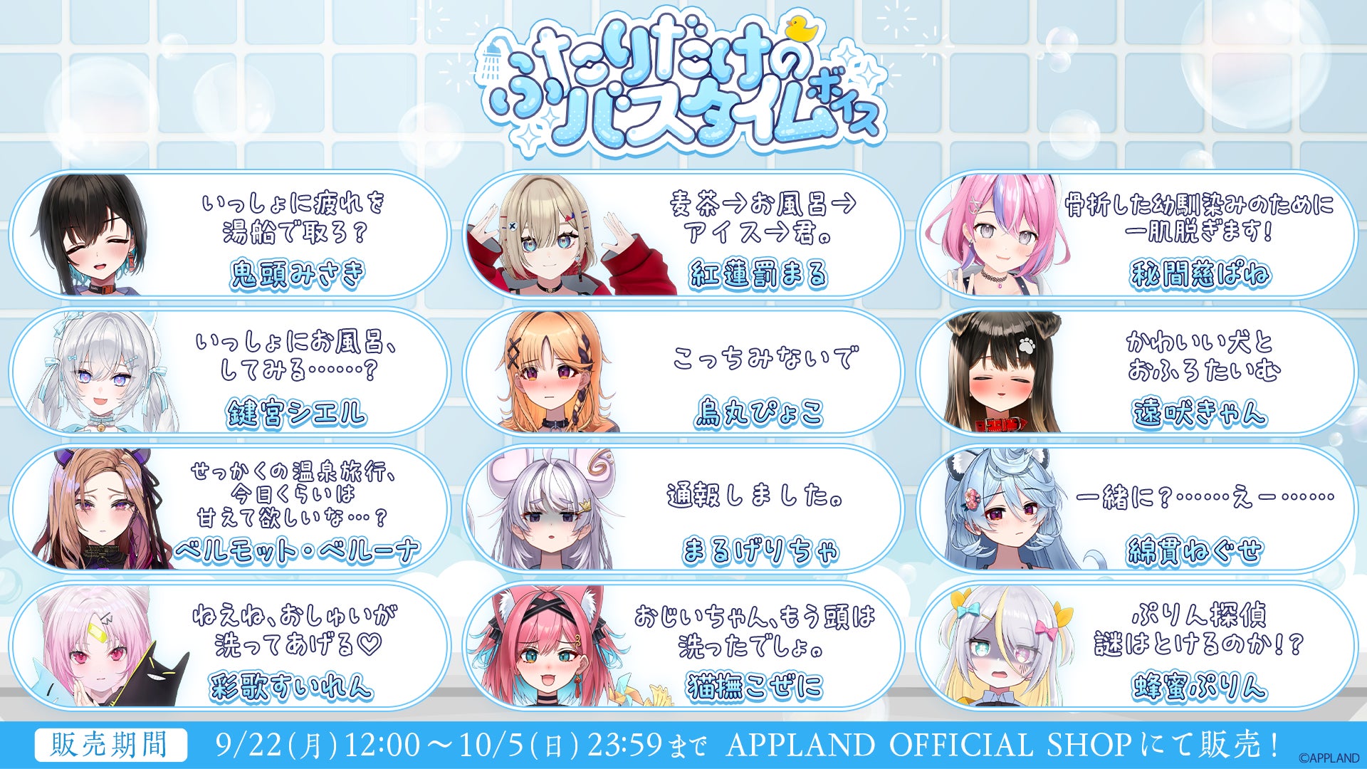 アップランド所属「.LIVE」・「ぶいぱい」メンバーによるバイノーラルボイスを2025年9月22日(月)より販売いたします!『湯けむりに溶け込む声で、あなたの疲れを癒やす』をテーマに、.LIVEメンバーとぶいぱいメンバーそれぞれが考案した、バスタイムに関するシチュエーションが楽しめるボイスコンテンツです。是非お楽しみください!