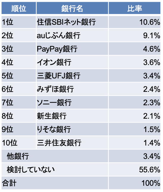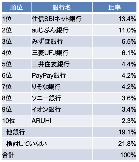 下記表の通り、住信SBIネット銀行とauじぶん銀行の2強となりました。なお、3位〜5位はメガバンクが占めています。メガバンクですが、金利面では上位2行に負ける銀行もあるものの、認知度が非常に高く、また不動産会社営業マンから紹介を受けるケースも多いため、上位に位置しているものと考えられます。