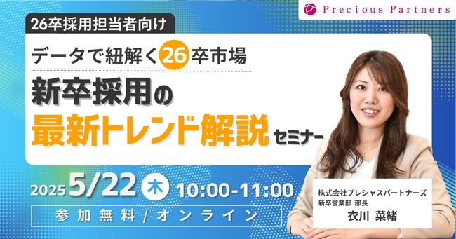 採用コンサルティング事業を行う株式会社プレシャスパートナーズ(本社:東京都新宿区、代表取締役社長 CEO:髙﨑 誠司)は、2025年5月22日(木)に『【採用担当向け】データで紐解く26卒市場|新卒採用の最新トレンド解説セミナー』をオンラインにて開催いたします。