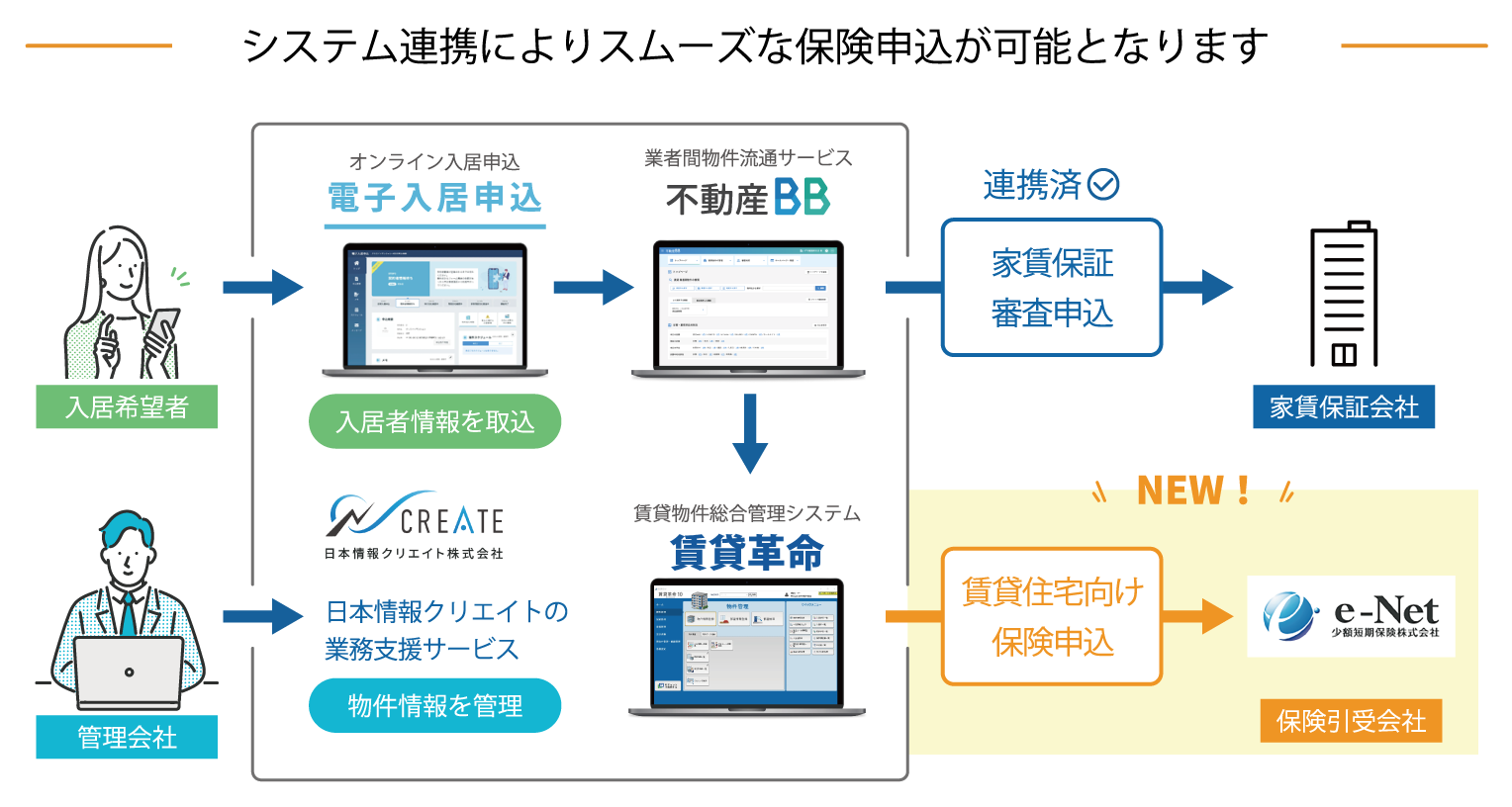 入居申込をオンラインで完結する日本情報クリエイトの「電子入居申込サービス」から取込まれた入居者情報と、不動産管理会社様がシステム上で管理する物件情報をe-Netの保険システムに連携します。これによりe-Netの賃貸住宅向け保険をご利用いただく入居希望者様、管理会社様は従来の一般的な手続きと異なり、手作業での保険申込の手間や記載漏れ確認などのストレスが少ない、スムーズな保険申込が可能となります。