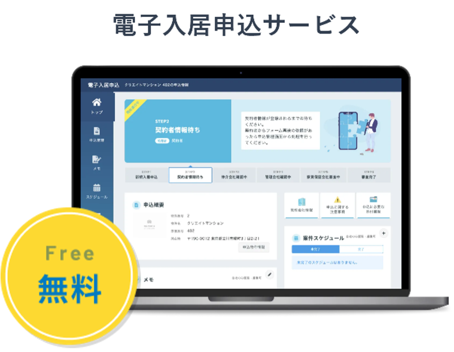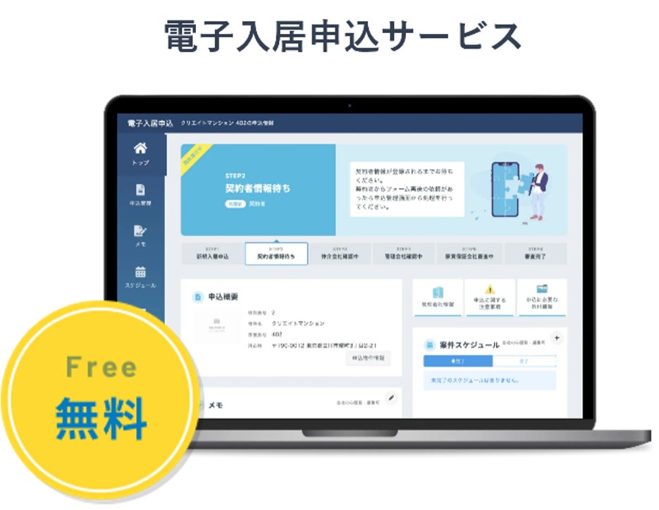 電子入居申込サービスは、日本情報クリエイトが不動産会社に向けて提供する無料のサービスであり、導入することで入居申込のやり取りのほとんどをオンラインで完結させることができます。また、クラウド型の賃貸物件総合管理システム「賃貸革命10」と一緒にご利用いただくことで、物件情報や入居者情報等の共通のデータが連携し、作業担当者はより広い範囲での業務効率化が実現します。