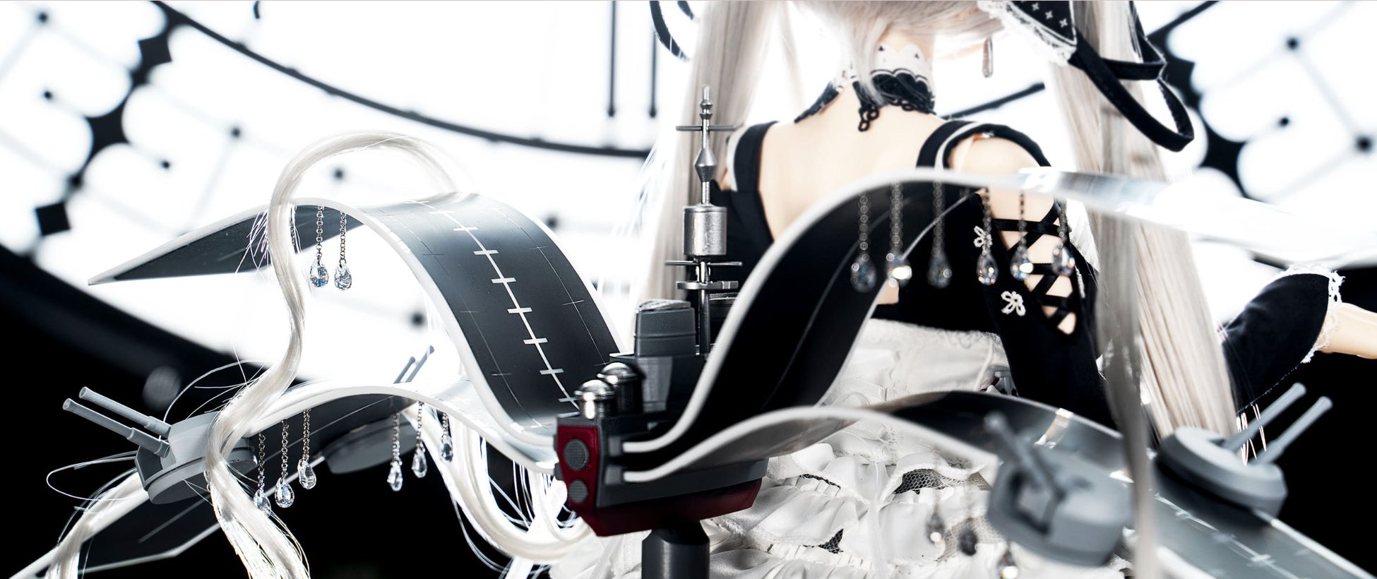 ビジューが煌めくチョーカーから、レディの秘めたる胸許を伝う布地、羽根のように広がるエプロンまで、ボリューミーで美麗なデザインを丁寧に再現されています。