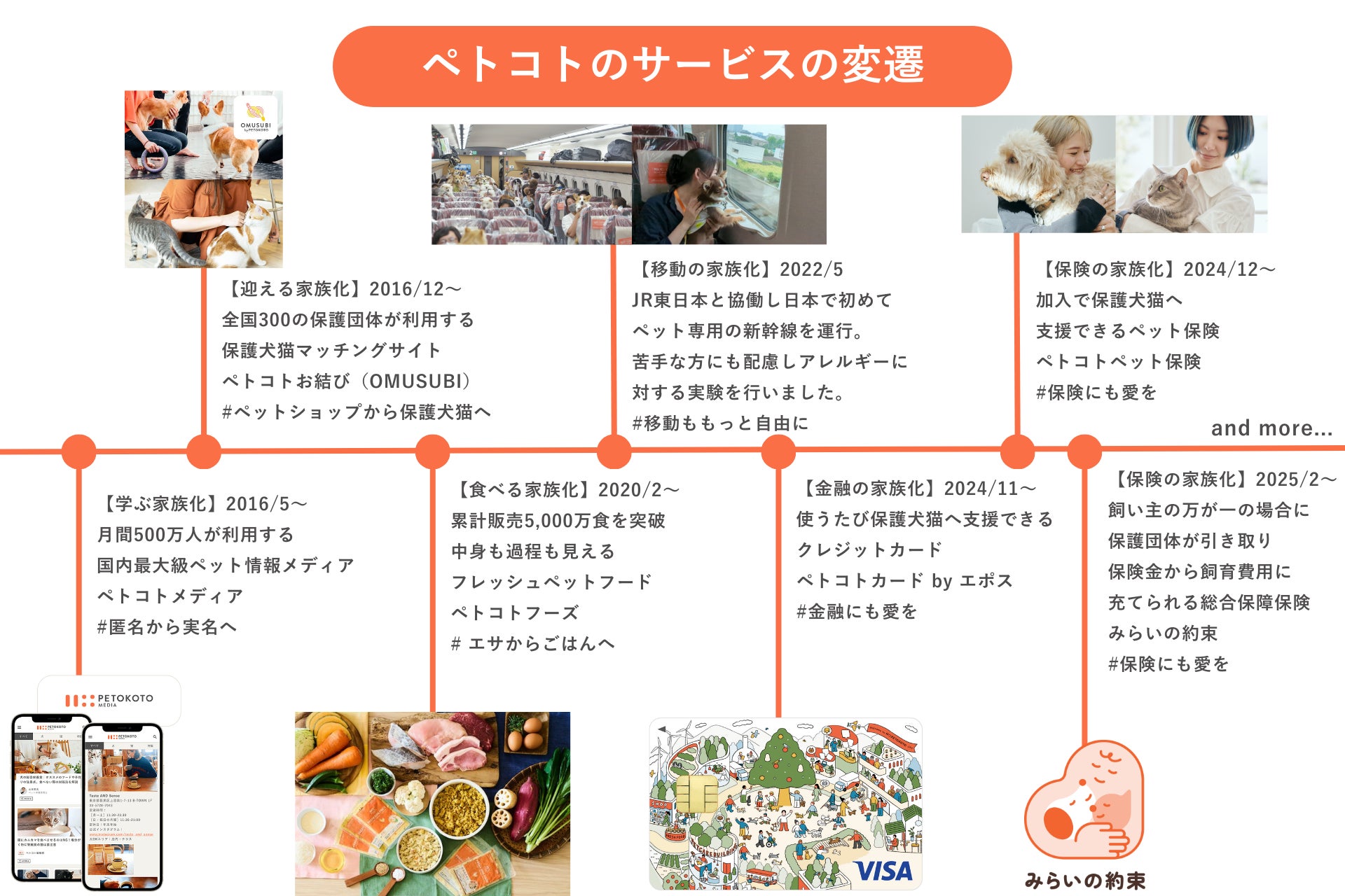 2022年5月にはJR東日本と提携し日本初のペット専用新幹線の運行、2024年11月には丸井と提携し使うだけで保護犬猫に支援できるクレジットカード「ペトコトカード」、12月にはT&D保険グループのペット&ファミリー損害保険株式会社と提携し加入するだけで保護犬猫に支援できるペット保険「ペトコトペット保険」、25年2月にはリトルファミリー少額短期保険株式会社と提携し飼い主さまの“もしも”のときに愛犬・愛猫の未来を守る保険「みらいの約束」の販売を開始しました。