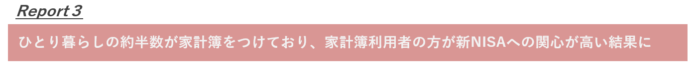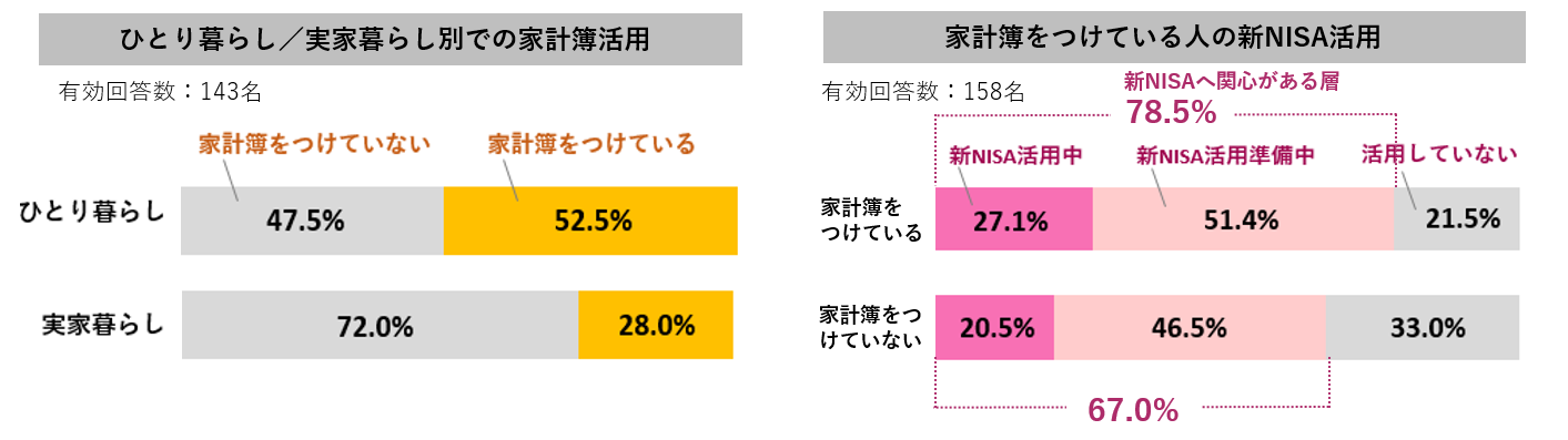 家計簿の利用状況では、ひとり暮らしのおよそ半数以上が家計簿を活用している一方で、実家暮らしで家計簿を利用している割合は3割程度という回答になりました。なお、家計簿利用と新NISAの利用状況でみると、家計簿をつけている人の方が新NISA利用率が6.6%高く、準備中の人も含めると家計簿をつけている人では関心度が11.5%も高いことが分かりました。この結果から、ひとり暮らしをしている層では、家計管理を通して必然的にお金に対する意識が高まり、投資に対する関心も高まっているのではないかと考えられます。