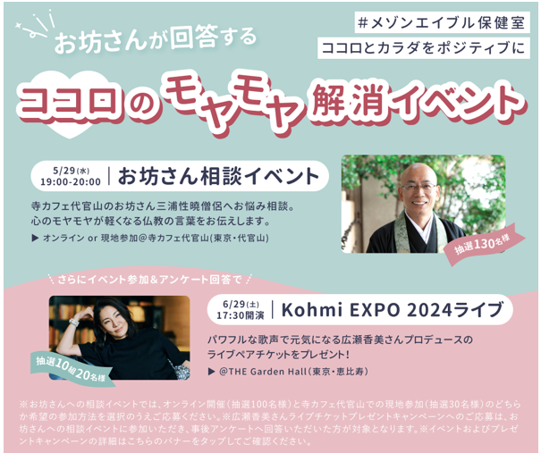お部屋探しのエイブルが運営するひとり暮らし女性応援サービス「メゾンエイブル」は、ひとり暮らしの生活が安心・快適でポジティブなものとなるよう応援しています。今年3月に開催したメゾンエイブルマネー講座に続き、5月はメンタルヘルスケアを目的に「#メゾンエイブル保健室|ココロとカラダをポジティブに」と題し、お坊さんへの相談オンラインイベントを開催いたします。概要は下記の通りです。