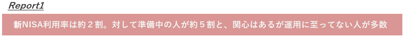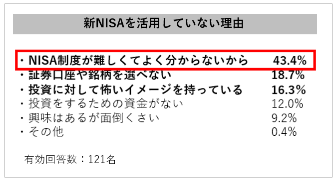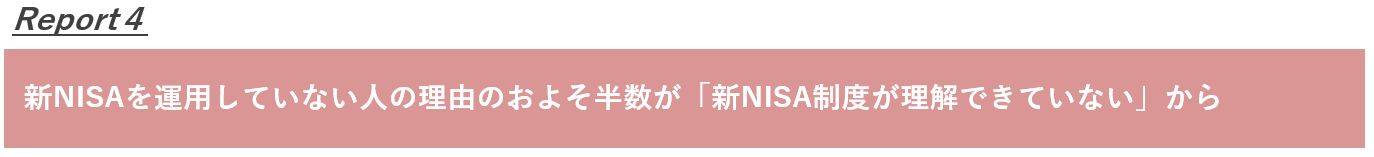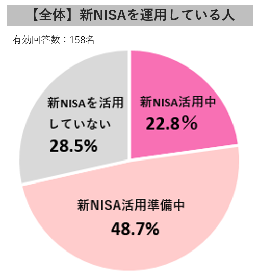新NISA(旧NISA含む)を運用している人は、全体回答のうち22.8%と少数派に。最も多かった回答は、証券口座の開設や、投資商品について情報収集中など「新NISA活用準備中」の方が48.7%と多く、およそ半数の方が新NISAに興味関心を持ち運用してみたいと考えてはいるものの、まだ運用には至っていないという状況が分かりました。