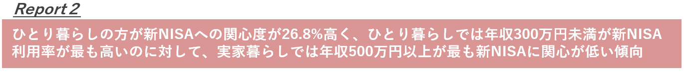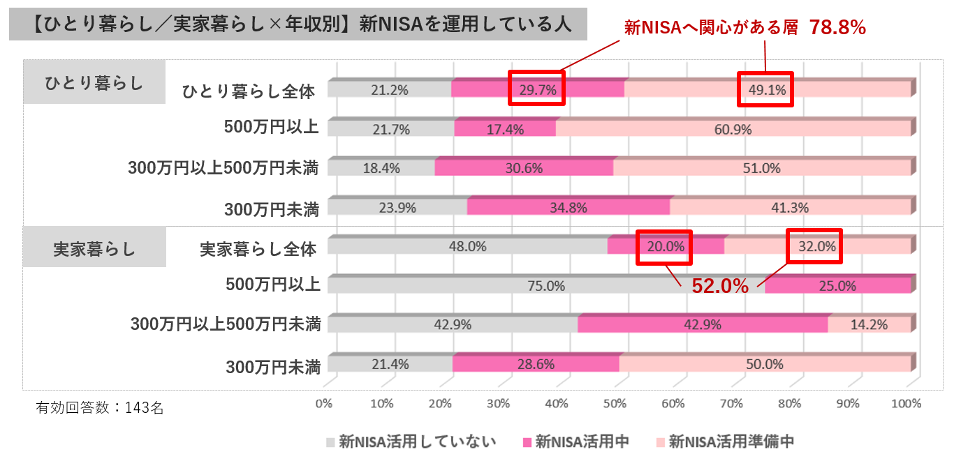 新NISAの利用率は、ひとり暮らし29.7%、実家暮らし20.0%と、ひとり暮らしの方がおよそ1割利用率が高い結果に。また準備中の層も含めると、ひとり暮らしの方が新NISAに対して関心度が26.8%高いことが分かります。年収別では意外にも実家暮らし×年収500万円以上の層が最も新NISAに関心が低く、ひとり暮らしでは年収300万円未満の層が新NISA利用率34.8%と最も高い回答となりました。