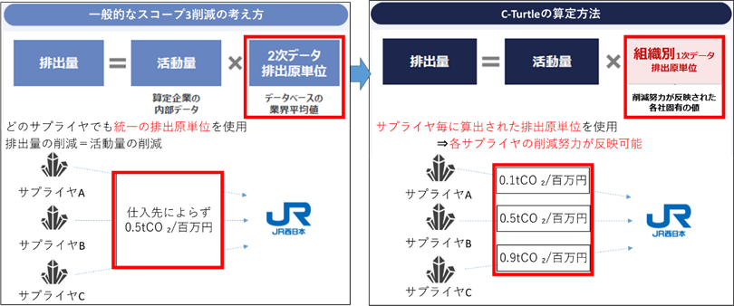 NTTデータおよび株式会社NTTデータ関西(以下:NTTデータ関西)は「C-Turtle」の提供に留まらず、正確な排出量可視化に向けたコンサルティングならびに、削減に向けた解決策の提案を行いJR西日本グループのCO2排出量スコープ3削減に向けた活動の支援を実施していきます。