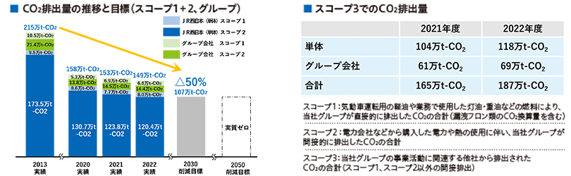 JR西日本グループでは、環境長期目標「JR西日本グループゼロカーボン2050」において、2050年のグループのCO2排出量「実質ゼロ」をめざし、その中間目標として、2013年度比で、2030年度に▲50%削減(スコープ1+2、連結)する計画を掲げています。スコープ1、2の排出量に加え、スコープ3(サプライチェーン上の排出量)についても、より正確な把握と削減の取り組みを推進することで、JR西日本グループは、取引先の皆さまとともに、持続可能な社会の実現に貢献することをめざします。
