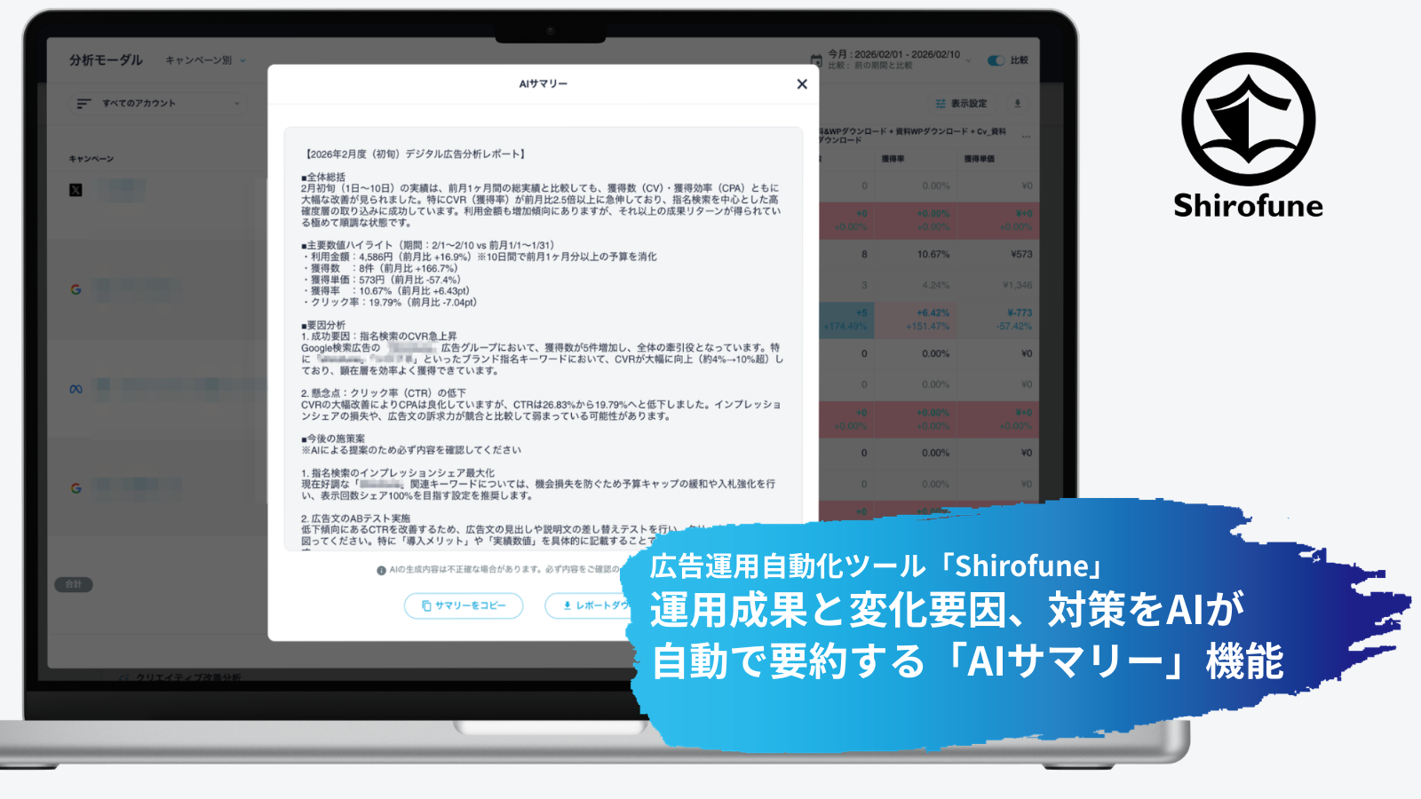 株式会社Shirofune(本社:東京都中央区、代表:菊池満長)は、広告運用自動化ツール「Shirofune」のレポート自動生成機能が生成する「変化分析レポート」で、レポート内の広告パフォーマンス変動の数値や要因、今後の効果的な施策を生成AIが分析し、要点を簡潔にテキストでまとめる「AIサマリー」を提供します。