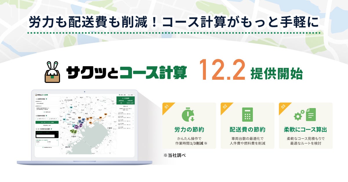 CBcloud株式会社(本社:東京都千代田区、代表取締役CEO:松本隆一、以下「CBcloud」)は、物流現場の効率化と生産性向上を支援する新サービス「サクッとコース計算」を12月2日より無料で提供開始します。物流業界では、慢性的な人手不足が続く中、配送計画の策定にかかる負担や効率化の課題が現場で大きなテーマとなっています。さらに、ドライバーの労働時間規制強化により、従来以上に効率的かつ柔軟な運行体制の構築が求められています。本サービスは、配送計画の策定に悩む企業が対象で、指定した車両数や配達時間に応じた最適なコースを簡単に見積もることができます。配送計画を立てるために必要な条件(車両数や配送時間)をスピーディーに計算でき、配送業務の効率化をサポートします。
