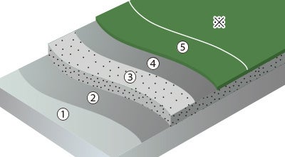 本工法は、水による膨れが特に発生しやすい自動車整備場に特化した工法です。新たに開発した専用下塗り材が、下地に密着して水分上昇を抑制し、膨れの発生を抑えつつ、耐衝撃性のある床を実現します。また、下塗り材を使用することで、従来工法よりも1~2日の工期短縮が可能となり、改修現場にも適しています。オプションのトップコートを使用することで、直射日光が当たる場所でも、紫外線による変色やタイヤ痕などの付着を抑制し長期間美観を保つことが可能です。