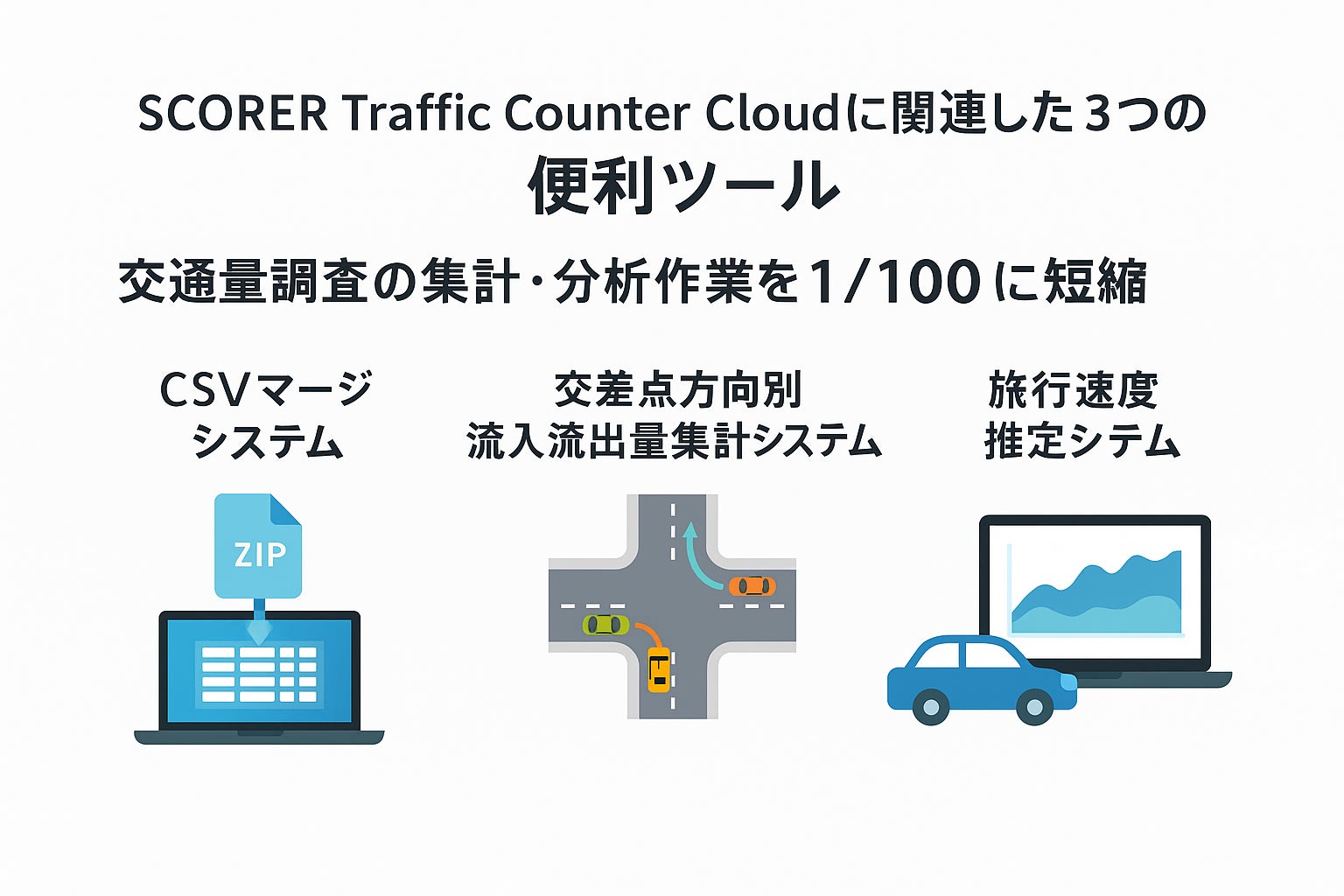 株式会社フューチャースタンダード(本社:東京都台東区、代表取締役:岡 寛、以下フューチャースタンダード)は、映像解析 AI「SCORER Traffic Counter Cloud」で取得した CSV データを一括マージ・自動集計・速度推定できる 3 つの Web ツールを本日より無償公開します。