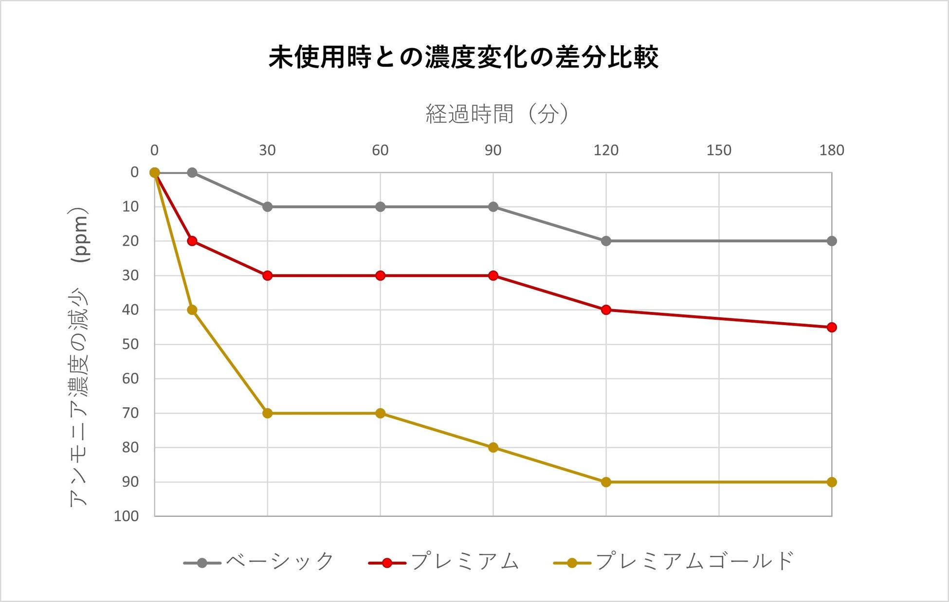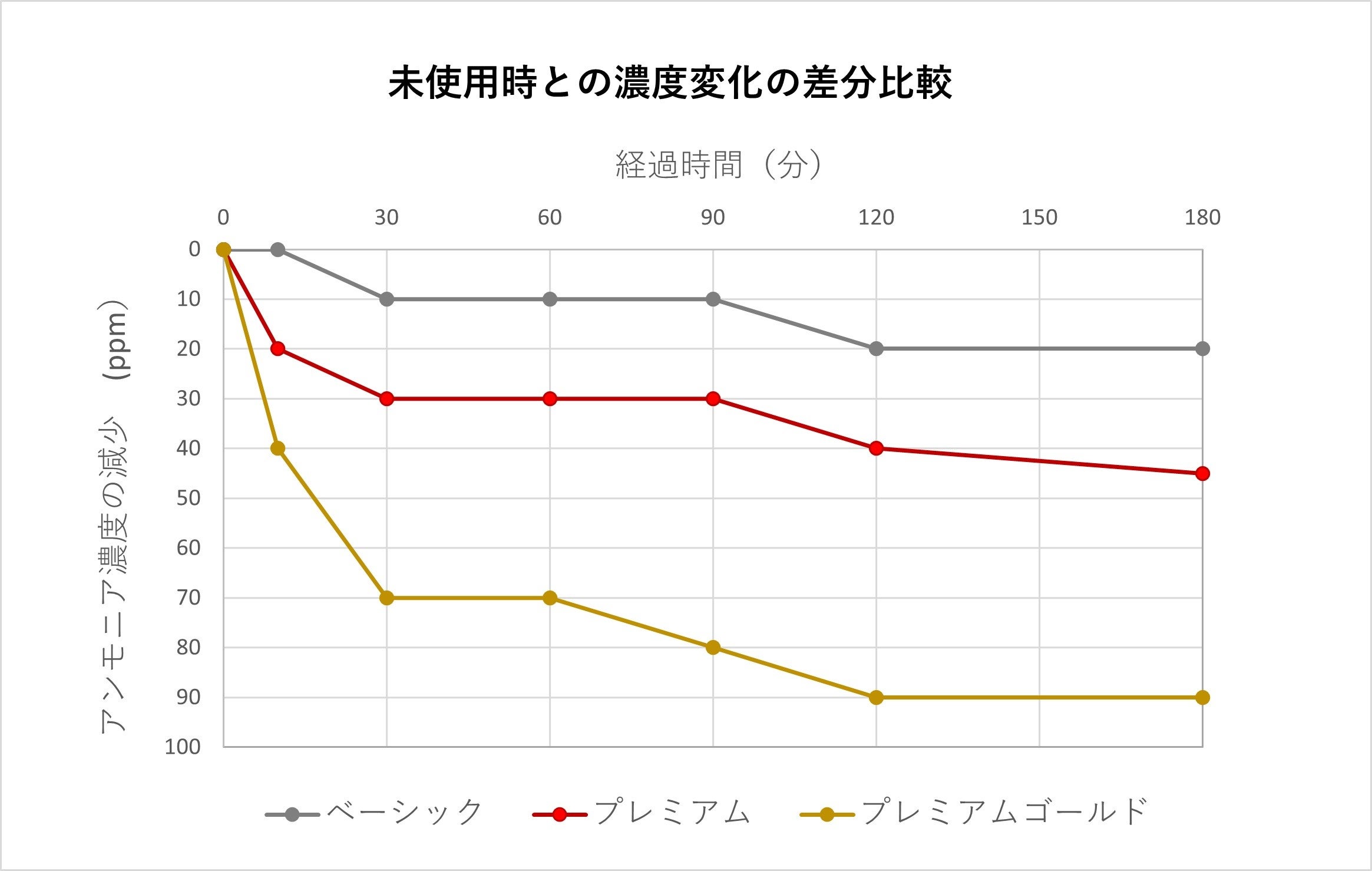 消臭剤未使用時とのアンモニア濃度の差分を測定すると、開始120分後にベーシックは20ppm、プレミアムは40ppm、プレミアムゴールドは90ppmとなっており、消臭性能がアップしていることがわかる。