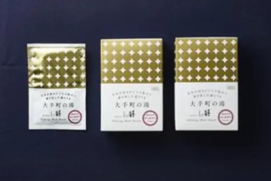 東京駅目の前の世界観がパッケージデザインと湯色で表現された入浴剤。“大手町の湯”ならではのシャンパンゴールドのお湯につつまれてリラックスしたひとときをお楽しみください。
