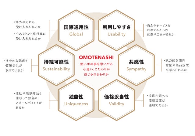 OMOTENASHI Selectionは、日本のおもてなし心あふれる商品・サービスを認定するため、選定会において下記項目で審査を実施します。