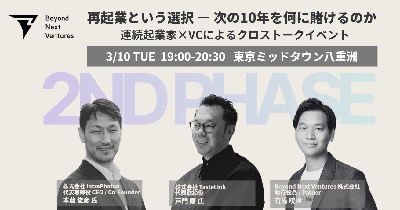 登壇者:株式会社IntraPhoton 代表取締役CEO 本蔵 俊彦氏、株式会社TasteLink 代表取締役 戸門 慶氏、当社 執行役員/パートナー 有馬 暁澄