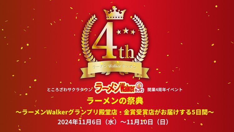 ラーメンWalkerキッチンは、来る2024年11月をもちまして4周年を迎えることとなりました。これもひとえに、足を運んでいただいたラーメンファンのみなさまや、全国各地から出店いただいた140名を超える店主のみなさまによるご支援の賜物と、スタッフ一同深く感謝しております。