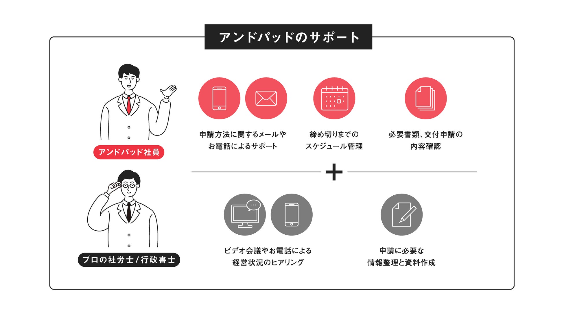 アンドパッドではお客様の申請にあたり、申請サイトへのログイン方法や、必要書類の取得方法など、申請に必要な事前準備から資料作成まで、社労士・行政書士とともにきめ細かいサポートを用意しています。