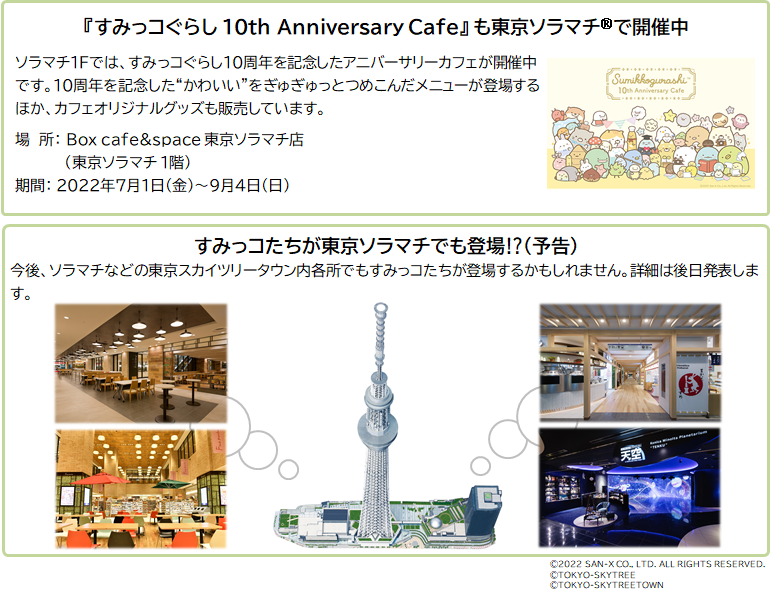 開催期間は、2022年8月10日(水)から11月9日(水)まで。すみっコぐらしの作者、よこみぞゆりさん描きおろしの特別デザインから、ここでしか見られないSKYTREE ROUND THEATER®によるスペシャル映像作品の上映、すみっコたちをイメージした夜空を彩る特別ライティング、そしてコラボメニューや限定グッズなど、10周年ならではの体験をたくさん用意しています。