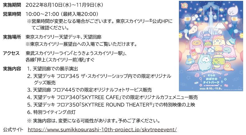 ともに10周年を迎える“すみっコぐらし”と“東京スカイツリー”の初のコラボレーションイベント『そらのおばけのナイトパーク in TOKYO SKYTREE ®』 のイベント詳細が決定しました。