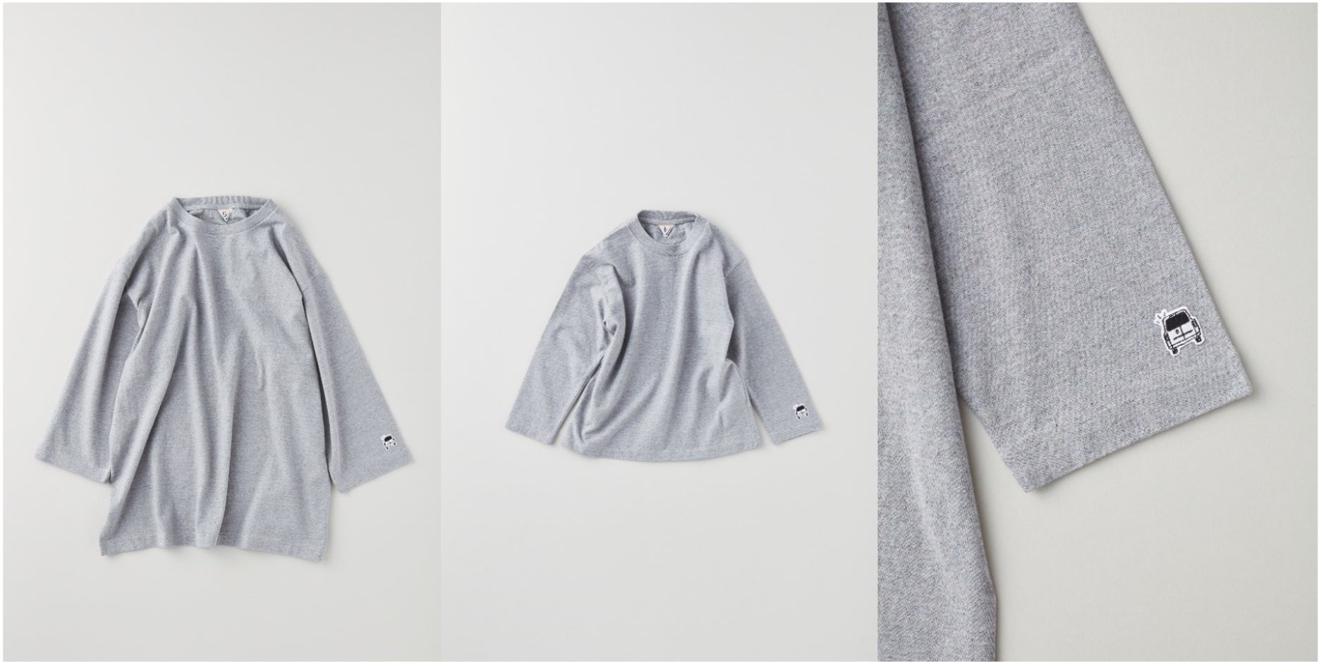 カットソーを生産した後にゴミとなってしまう裁断屑や着古した衣料品を再加工し、新しい糸に戻す「反毛」という技術を用いたサスティナブルなアイテム。半分量の白色系オーガニックコットンを混ぜることで、独特な杢(もく)感を醸しだしています。袖口にクリエイティブユニットBob Foundation(ボブ・ファウンデーション)朝倉洋美氏によるルノー カングーのリアをイメージしたワッペンをあしらった特別な一着です。