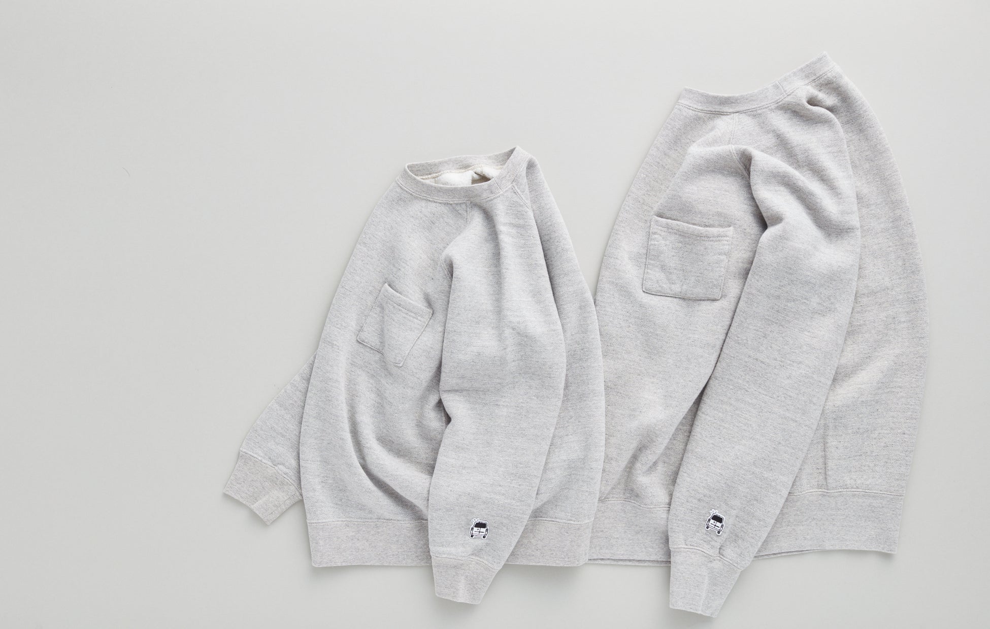 リサイクルコットンと超長綿を掛け合わせ、古き良きヴィンテージスウェットを再現した生地を使用したやわらか・ふっくらなスウェット。「杢グレー」の色味にもこだわって制作しています。袖口にはのクリエイティブユニットBob Foundation(ボブ・ファウンデーション)朝倉洋美氏のデザインによるワッペンをさりげなくあしらっているところがポイントです。