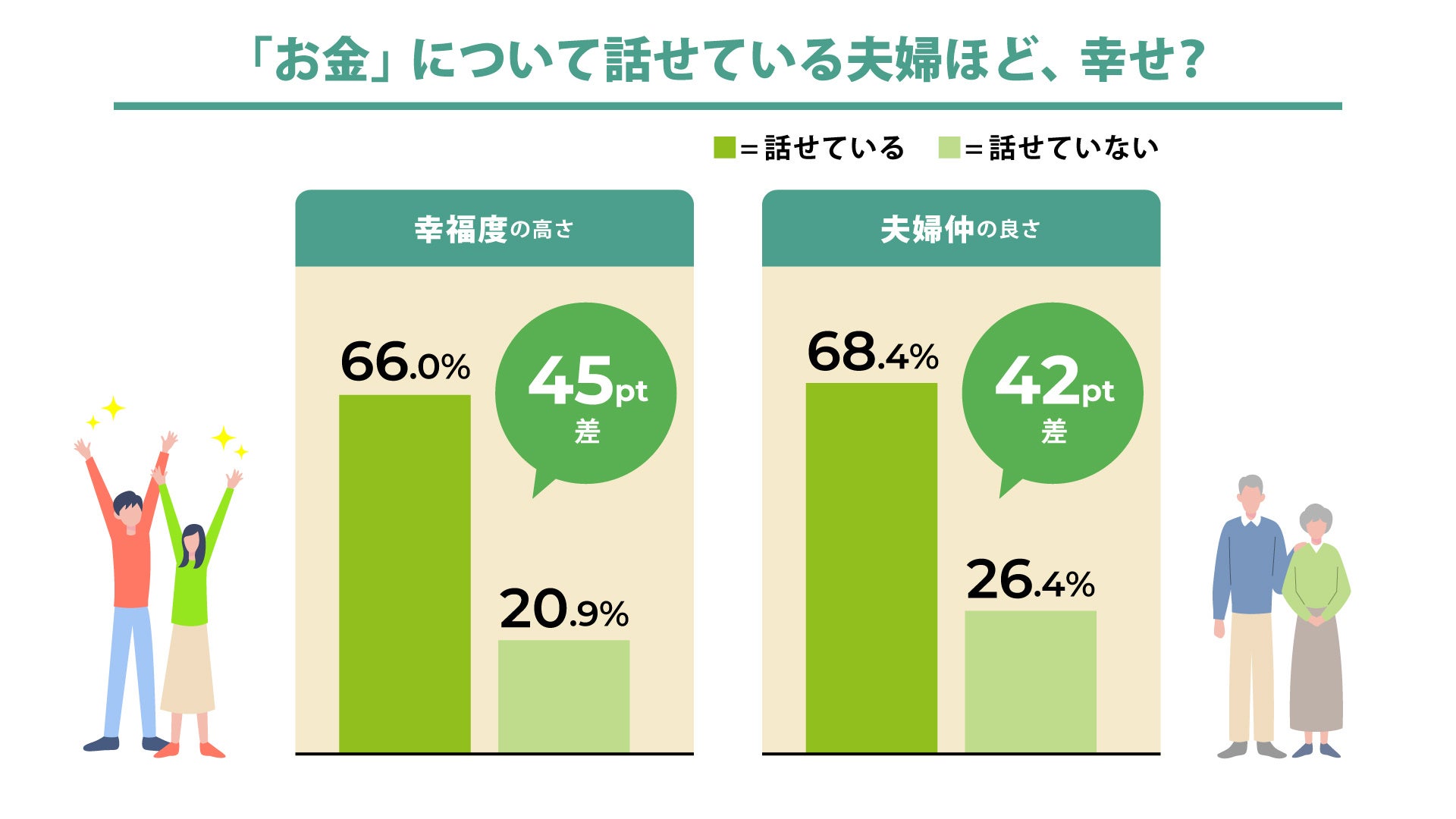 お金やライフプランについて話せている家庭の約7割が、「夫婦仲が良い」と回答。「幸福度」や「将来への期待感」も、話せていない家庭と比べて40ポイント以上の差をつける結果に。
