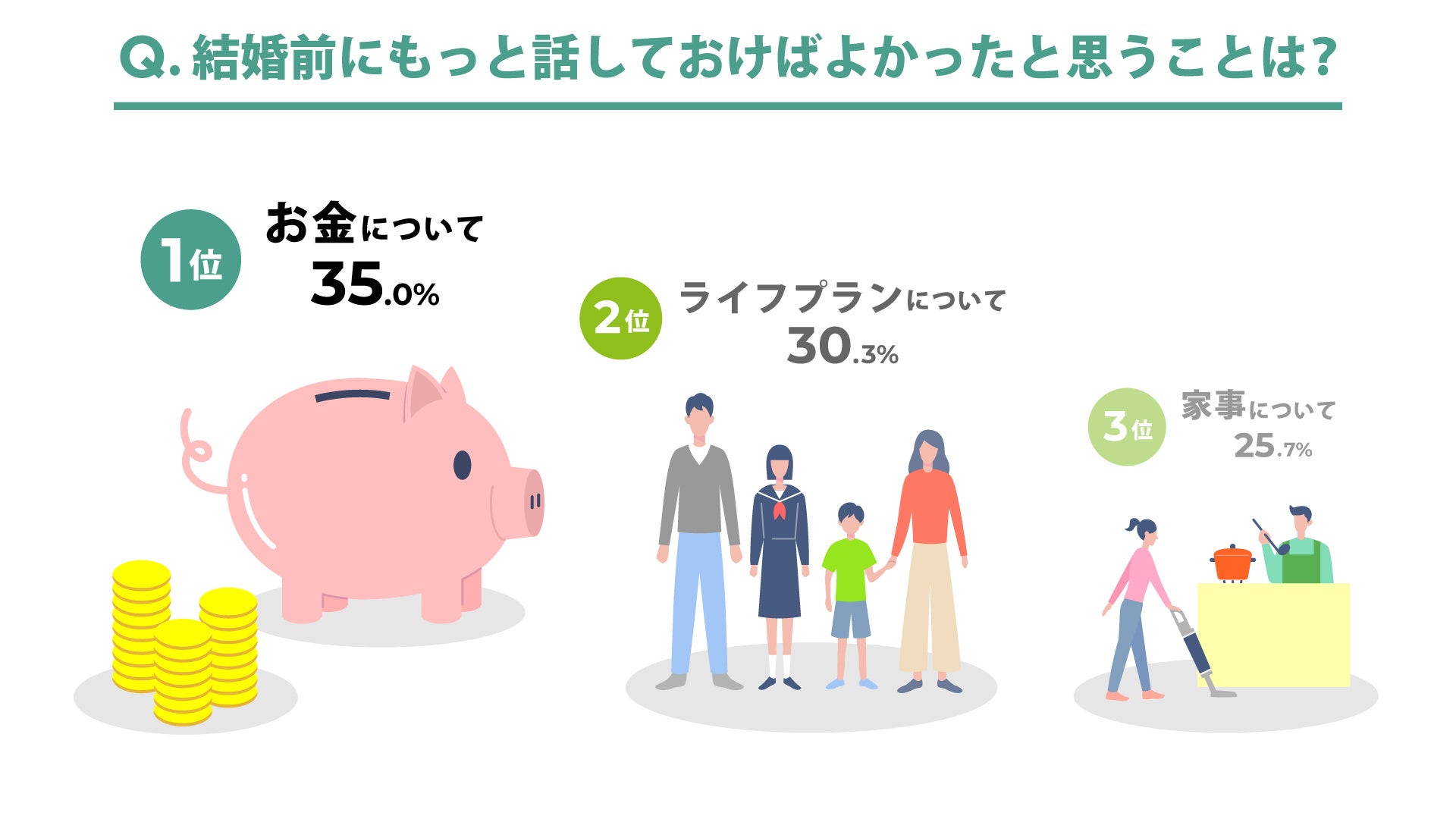 婚活経験者が、結婚前にもっと話しておくべきだったと後悔した1位は「お金について」 ~お金やライフプランについて話せている家庭の約7割が、夫婦仲が良く幸福度も高い結果に~
