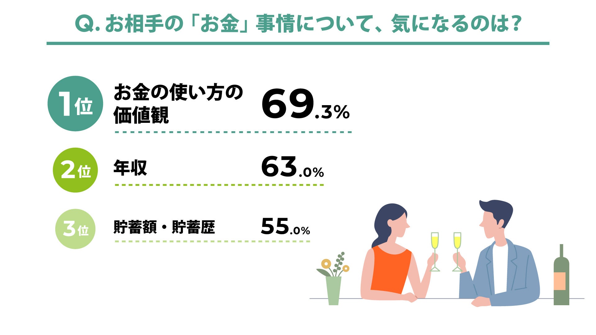 お相手のお金事情について、気になる項目のトップは「お金の使い方の価値観」。男性に比べ、女性の方が「年収」を気にする傾向にあることも明らかに。